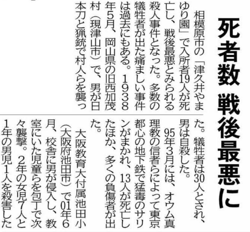 19人と言う数字は、まさに大量殺人であり、割と日本では起こっており、この点に着目した「TIME」誌が特集を組んでいます。